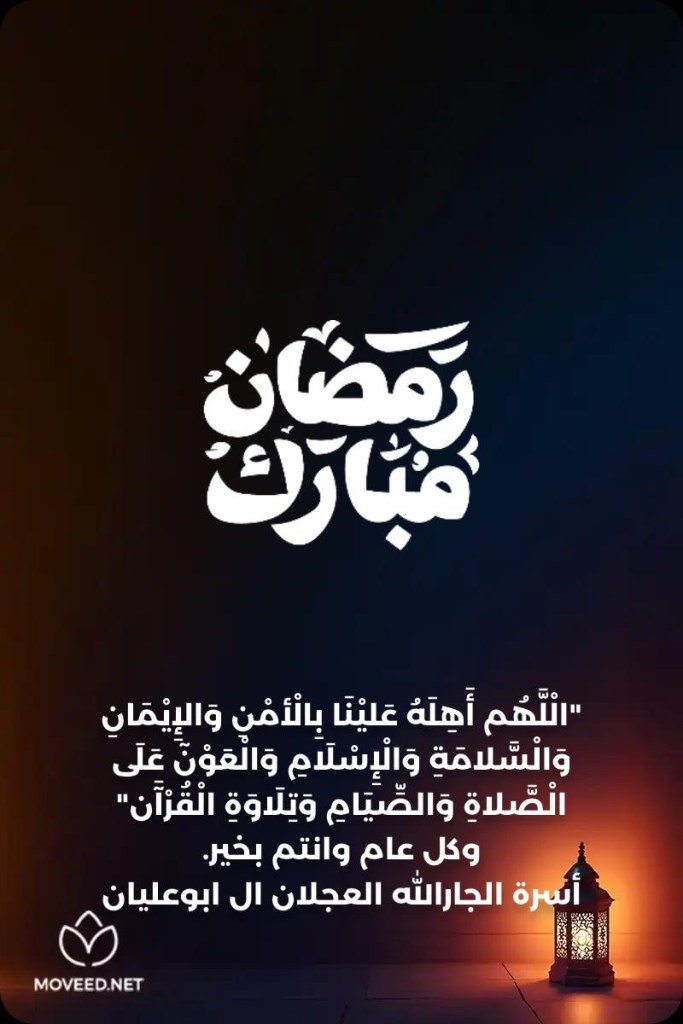 ”الْلَّھُم أَهِلَهُ عَليْنَا بِالْأمْنِ وَالإِيْمَانِ وَالْسَّلامَةِ وَالْإِسْلَامِ وَالْعَوْنٓ عَلَى الْصَّلاةِ وَالصِّيَامِ وَتِلَاوَةِ الْقُرْآَن” “أتاكم رمضان، شهرٌ يغشاكم الله فيه، فينزل فيه الرحمة، ويحط الخطايا، ويستجيب الدعاء، ويباهي بكم ملائكته، فأروا الله من أنفسكم خيرًا، فإن الشقيّ من حرم فيه رحمة الله” تنتهز اسرة الجارالله العجلان ال ابوعليان فرصة دخول شهر رمضان الكريم 1447 لتتقدم الى افرادها جميعا بالتهنئة والتبريك وكل عام وانتم بخير.