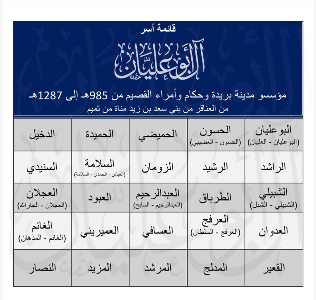 قائمة أسر أل أبوعليّان من العناقر من بني سعد بن زيد-مناة من تميم.